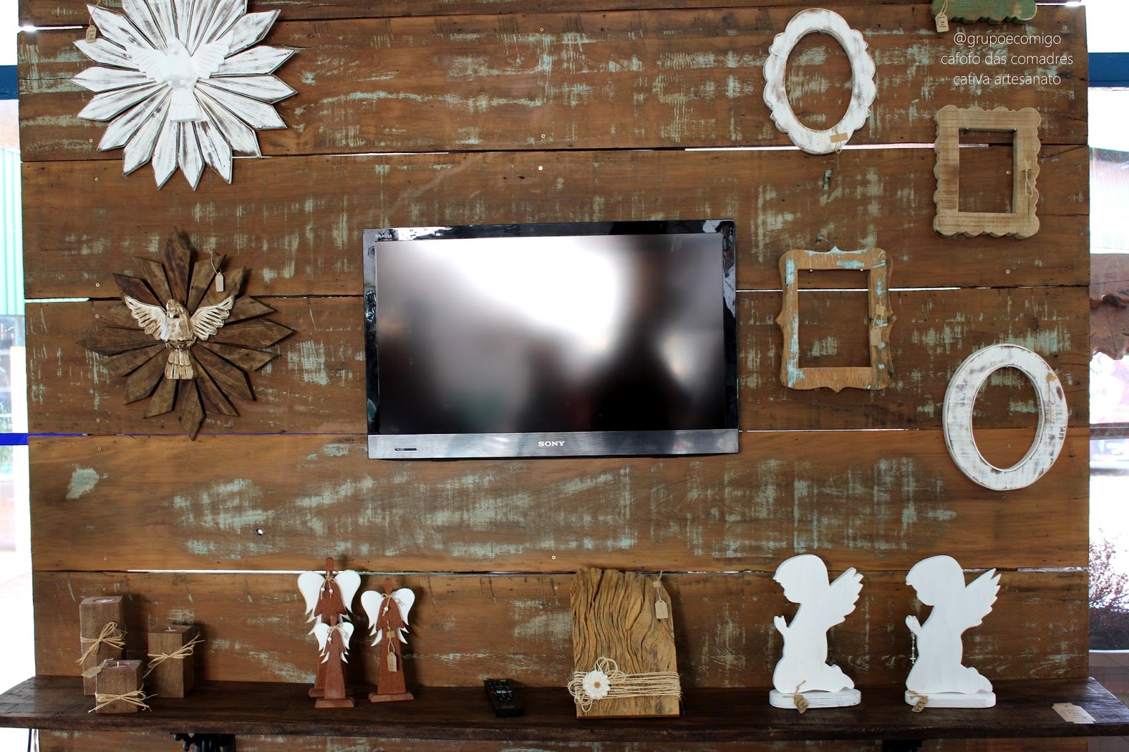Painel com madeira de demolição e objetos de decoração do Cafofo das Comadres: 45-3252 3322;